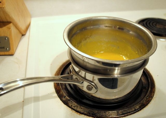 Using a double boiler, make a custard with 5 egg yolks, 2.5 Tablespoons of half and half, and 1/4 cup sugar. I use a bowl in a pot of simmering water. Let it cool slightly.