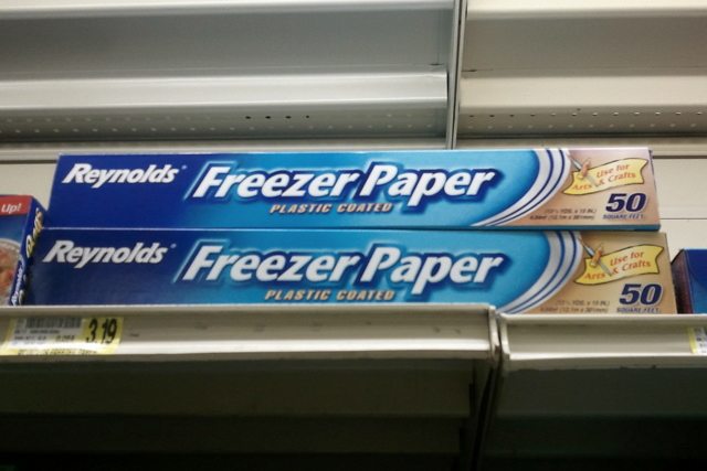 Surprise! Freezer paper is available at my local grocery store. This is amazing to me because my local grocery store is small and never seems to have normal things that I am looking for. I didn’t hold out much hope that it would have freezer paper. But there it was, on the top shelf near the plastic wrap, advertising its many craft uses right on the box. I quickly snapped this blurry shot with my cell phone and bought some.
