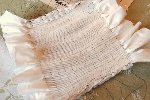 You can see in this photo that I have tied knots in the threads to hold the pleats in. As I worked on the smocking I tied them a bit tighter because I found that these pleats were too loose. Also in this photo you can see the beautiful gather that formed in the fabric below the pleats. Cute!