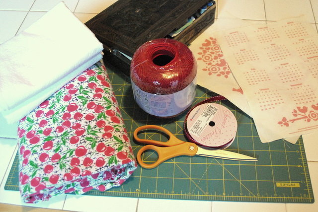 Above you can see my supplies: flour sack towels, cotton flannel with a cute cherry pattern, some red crochet floss (my favorite part of the finished hanging), some red ribbon, and sewing stuff.